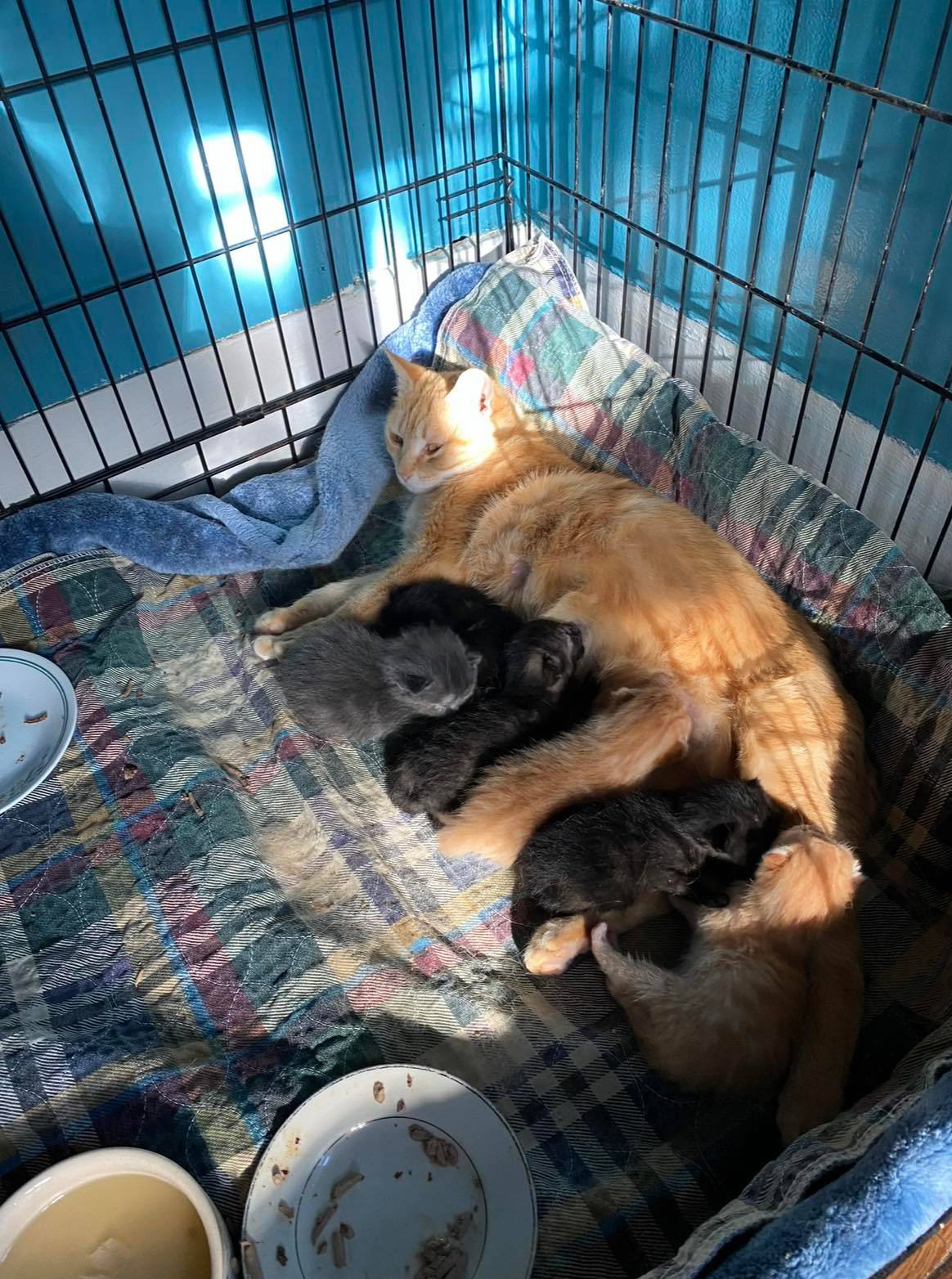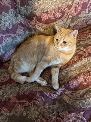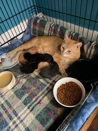 Sandy was found scrounging for food in a feral cat colony in Flint. Sandy is the rare orange tabby female, only 20% of orange cats are female, and she was heavily pregnant.